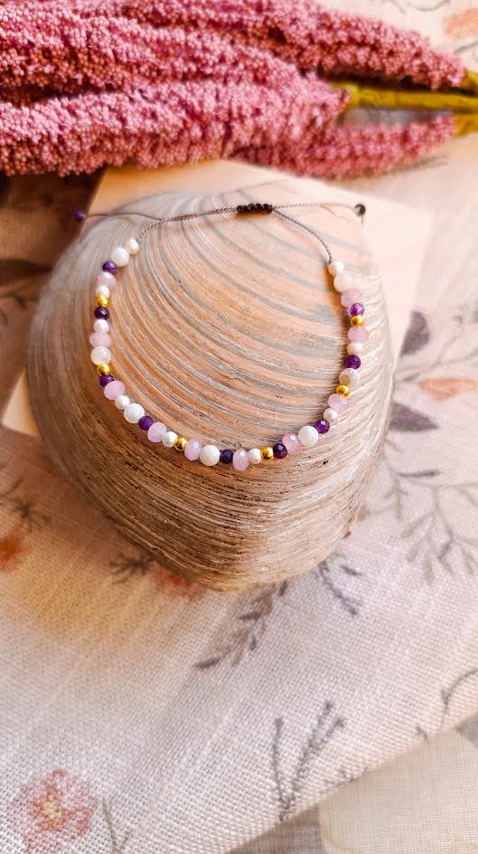 Ta wyjątkowa bransoletka została stworzona z myślą o kobietach, które cenią naturalne piękno i subtelną elegancję. Wykonana z ametystu, kwarcu różowego oraz pereł słodkowodnych, zachwyca delikatnym zestawieniem barw – od chłodnego fioletu, przez romantyczny róż, aż po klasyczną biel pereł.