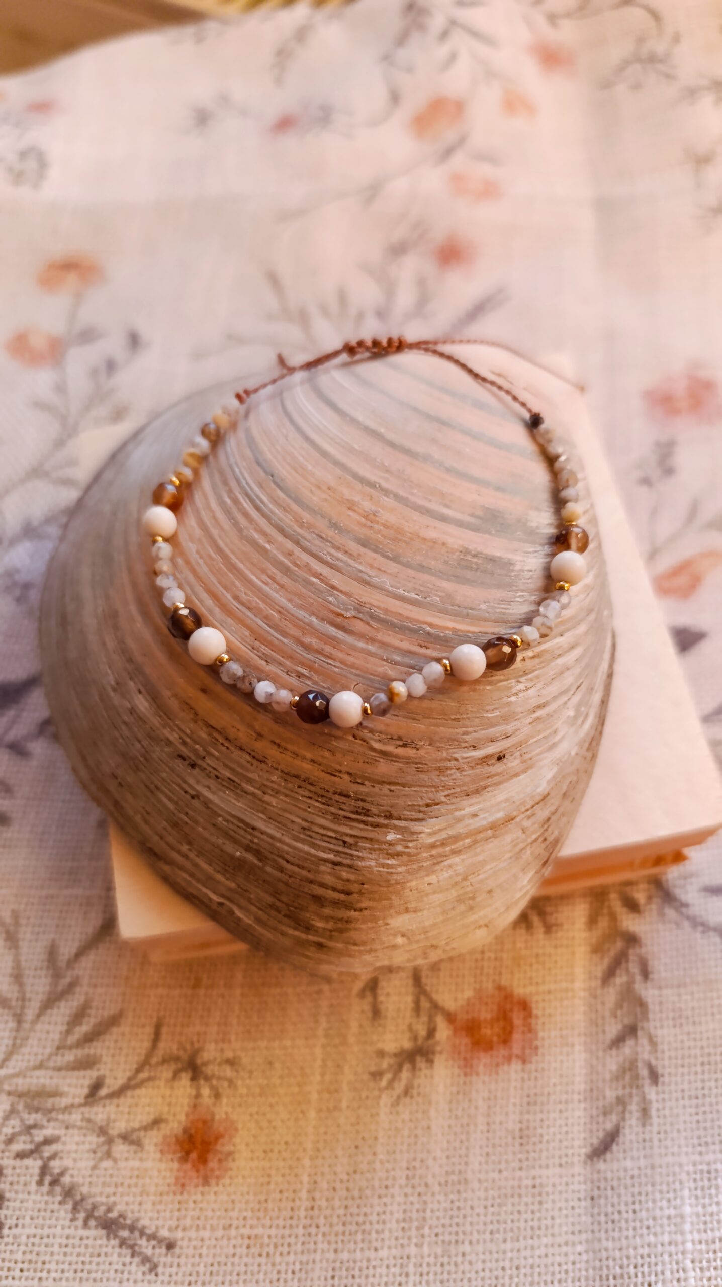 Delikatna bransoletka z drobnych kamieni naturalnych w odcieniach beżu, brązu i bieli, ozdobiona maleńkimi złotymi przekładkami. Idealna do codziennego noszenia – subtelna i elegancka