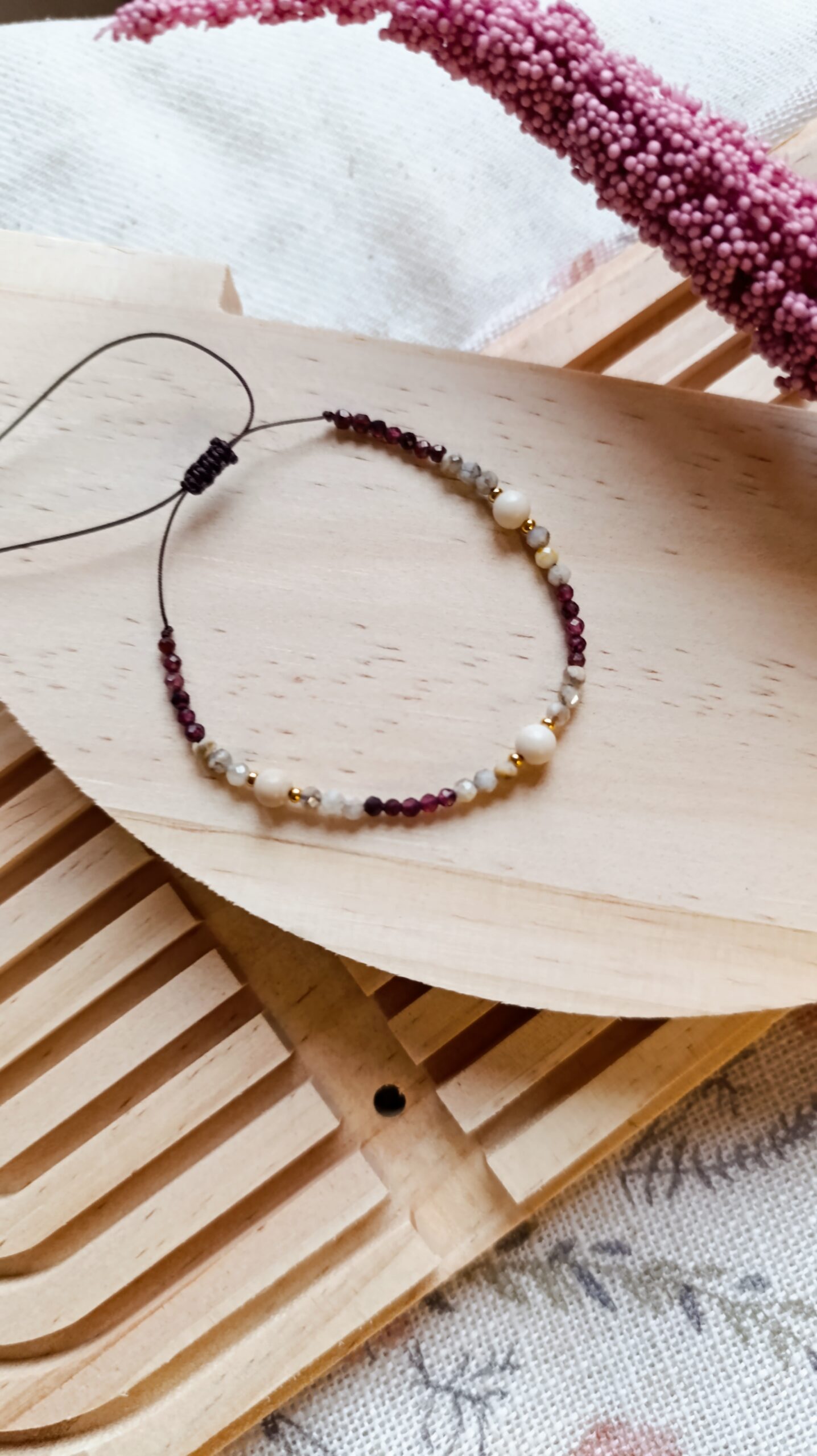 Bransoletka Twilight Whisper to opowieść o harmonii między światłem a cieniem, o chwili, gdy dzień powoli ustępuje miejsca nocy. Ręcznie wykonana na delikatnej nici nylonowej, łączy w sobie energię granatu, opalu