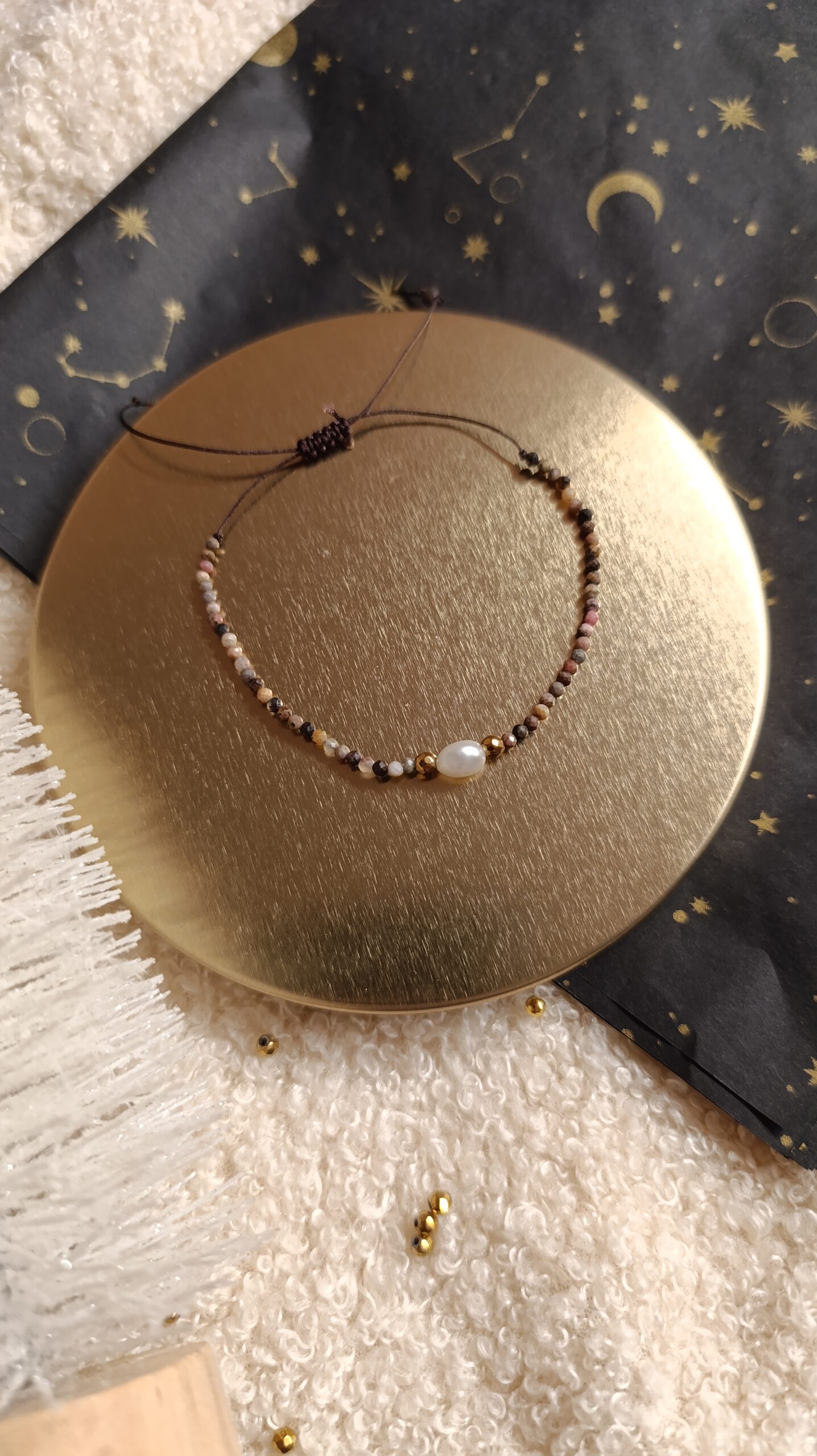 Delikatna, kobieca bransoletka wykonana ręcznie z drobnych koralików z rodonitu w naturalnych, stonowanych odcieniach różu, brązu i szarości. Centralnym punktem kompozycji jest subtelny element z perełki słodkowodnej, który dodaje całości elegancji i lekkości🤎