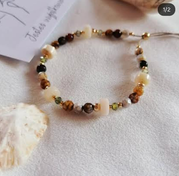 Bransoletka „Złoty Spokój” to połączenie elegancji i natury w najczystszej formie. Wykonana ręcznie na delikatnej jedwabnej nici, zachwyca subtelnym doborem kamieni – agatu, opalu i oliwinu.