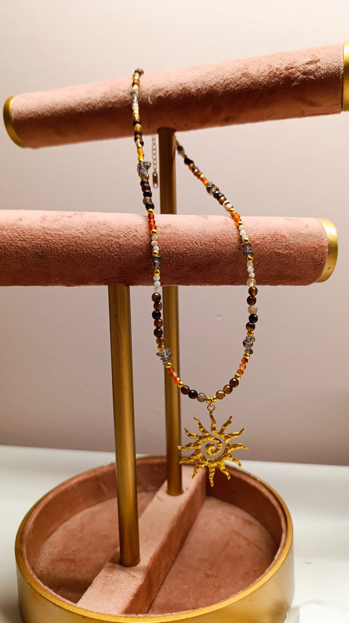 Całość dopełniają złote elementy ze stali nierdzewnej, odporne na zarysowania i utratę koloru. Centralnym punktem naszyjnika jest złoty wisiorek w kształcie słońca, który symbolizuje energię, siłę i optymizm.